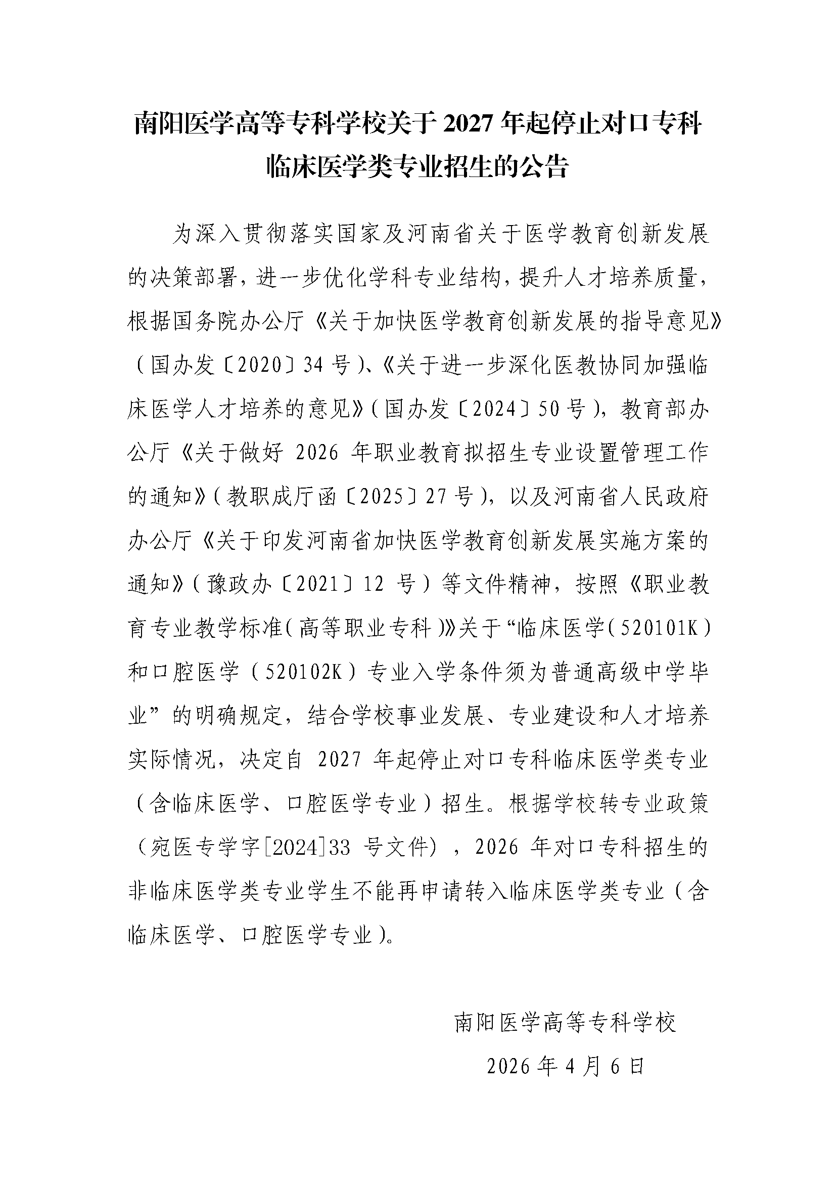 南阳医专关于2027年起停止对口专科临床医学类专业招生的公告