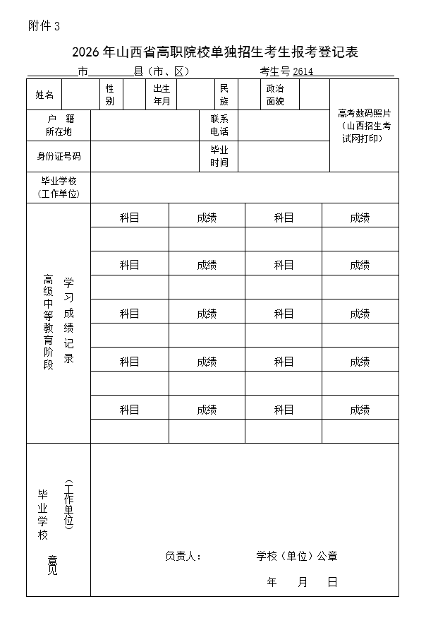 2、将考场座位号写在《2026年山西省高职院校单独招生考生报考登记表》(以下简称:《报考登记表》)左上角。