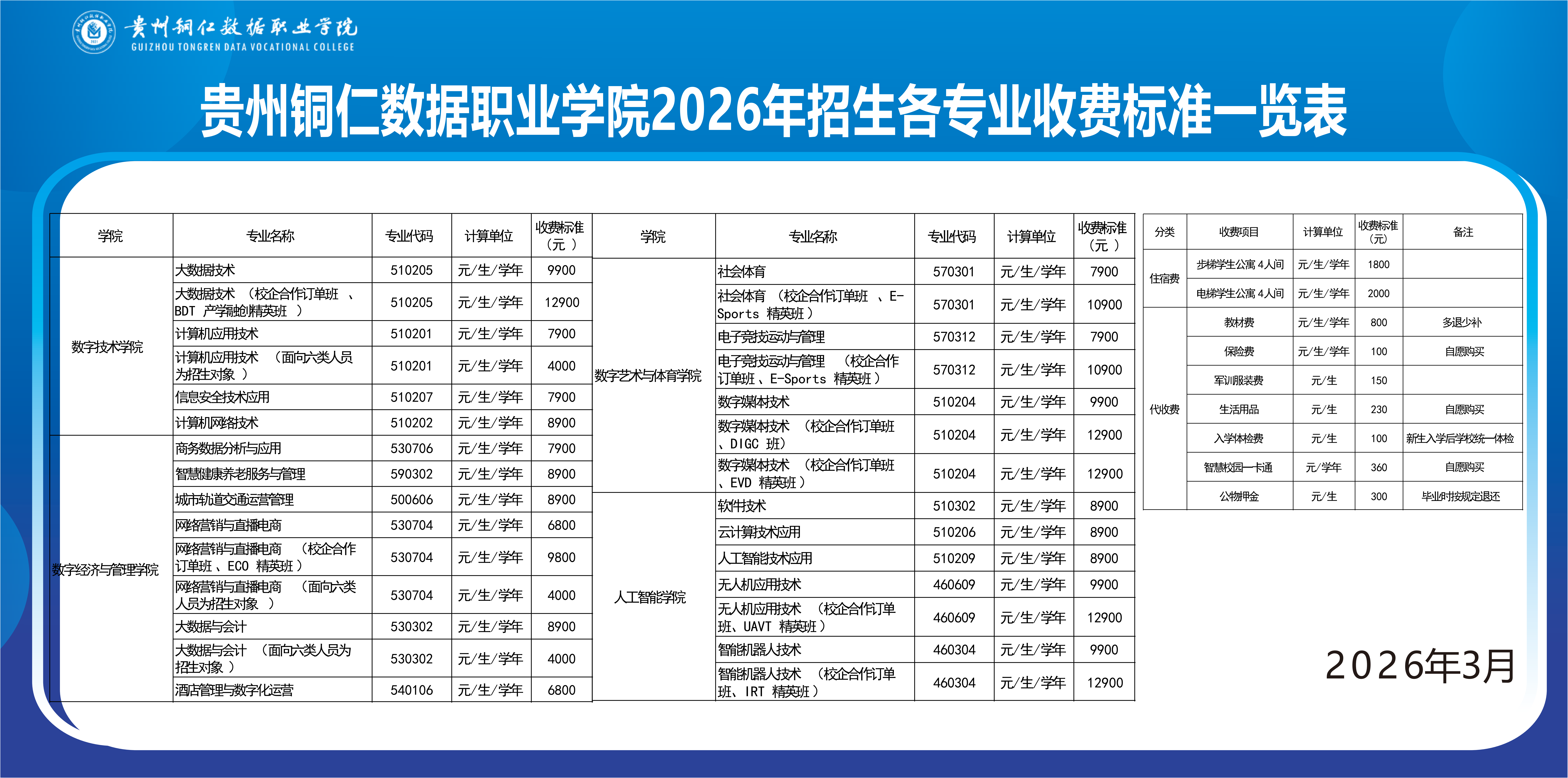 贵州铜仁数据职业学院2026年招生各专业收费标准一览表