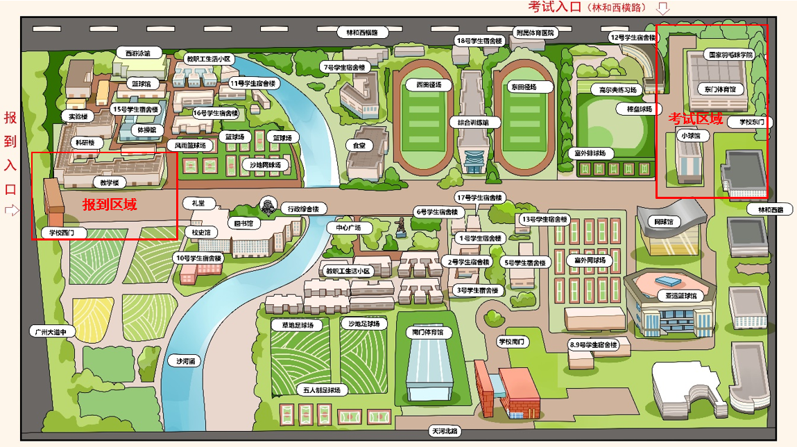 注意:1.所有考生报到从广州体育学院西门(广州大道)进出;羽毛球项目考试从广州体育学院北门(林和街道办事处对面)进出。