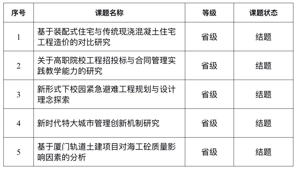 建设工程管理专业积极申报省、市级科研课题,迄今为止省级科研课题5项,市级科研课题1项。