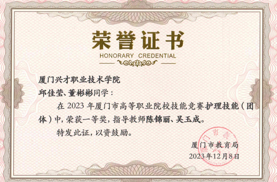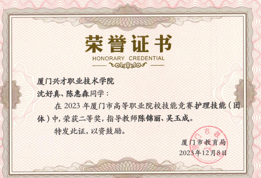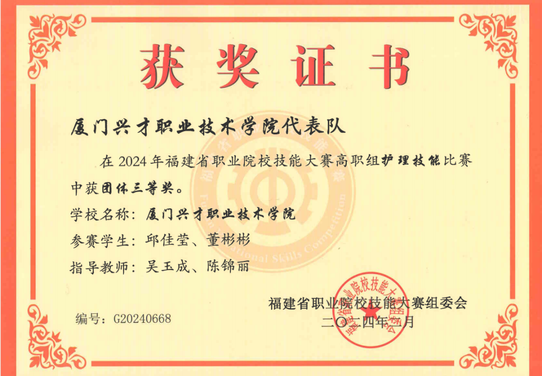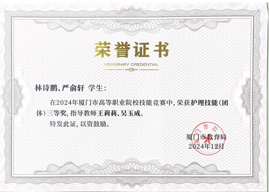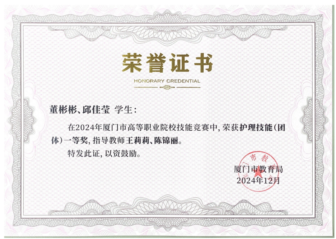 2024年获得厦门市高等职业院校技能竞赛--护理技能赛项一等奖和三等奖各一项