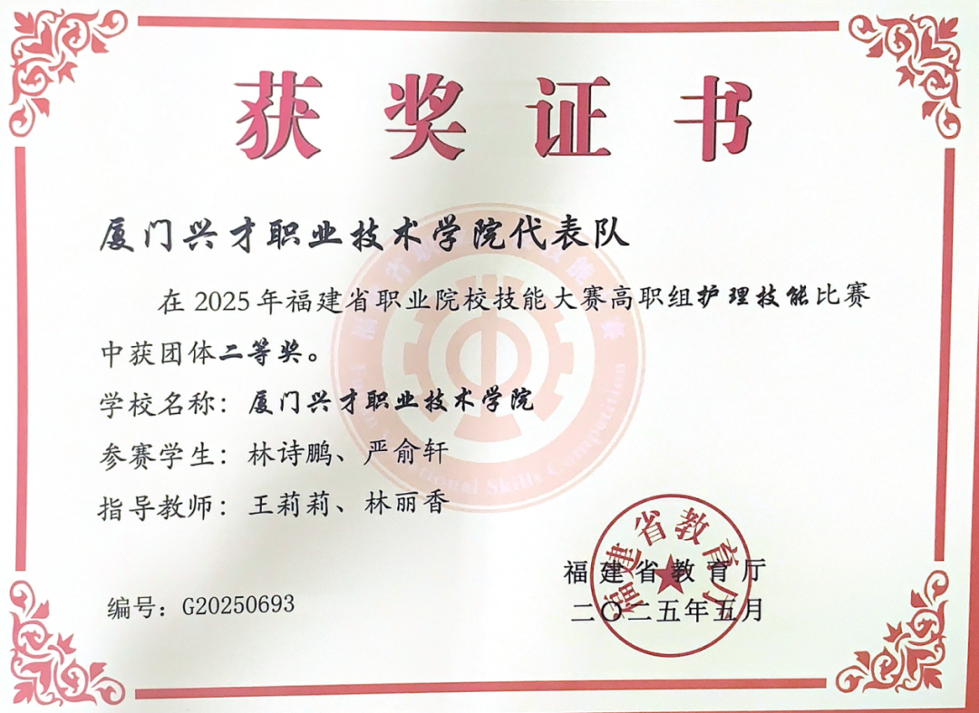 2025年获得福建省职业院校技能大赛高职组——护理技能赛项二等奖。