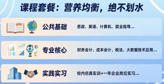 专业核心:财务会计、成本会计、税法、大数据技术应用、财务机器人、财务大数据分析、智慧化纳税申报……传统+前沿,全都有!