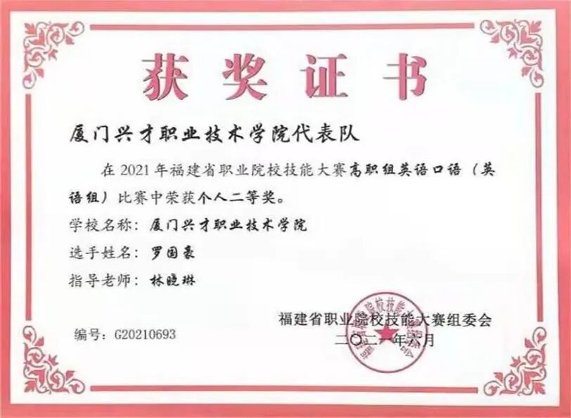 2025年10月 厦门市职业院校技能大赛英语口语(专业组):包揽一、二、三等奖。