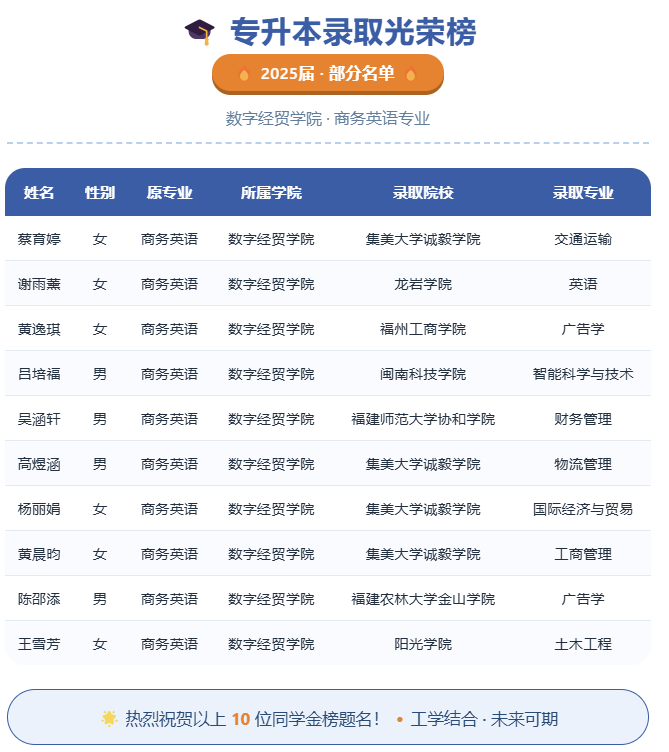 历年专升本上岸率稳居全校前列。学生可报考商务英语、英语、国际经济与贸易、跨境电商、电子商务、物流管理等本科专业。众多学子已成功考入福建商学院、泉州师范学院、莆田学院、闽江学院、集美大学诚毅学院、厦门大学嘉庚学院等知名本科院校。