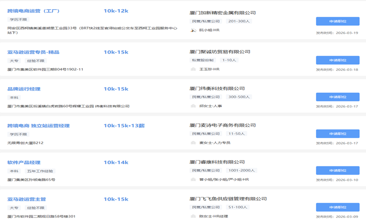 毕业生主要流向厦门软件园三期跨境电商/数字贸易企业、厦门自贸片区及海丝核心区外贸企业,以及福建、广东、江浙一带的品牌出海集团。胜任岗位包括:跨境电商运营、跨境英语主播、外贸业务员、海外社媒营销、AI数字营销、国际供应链专员/商务助理等。