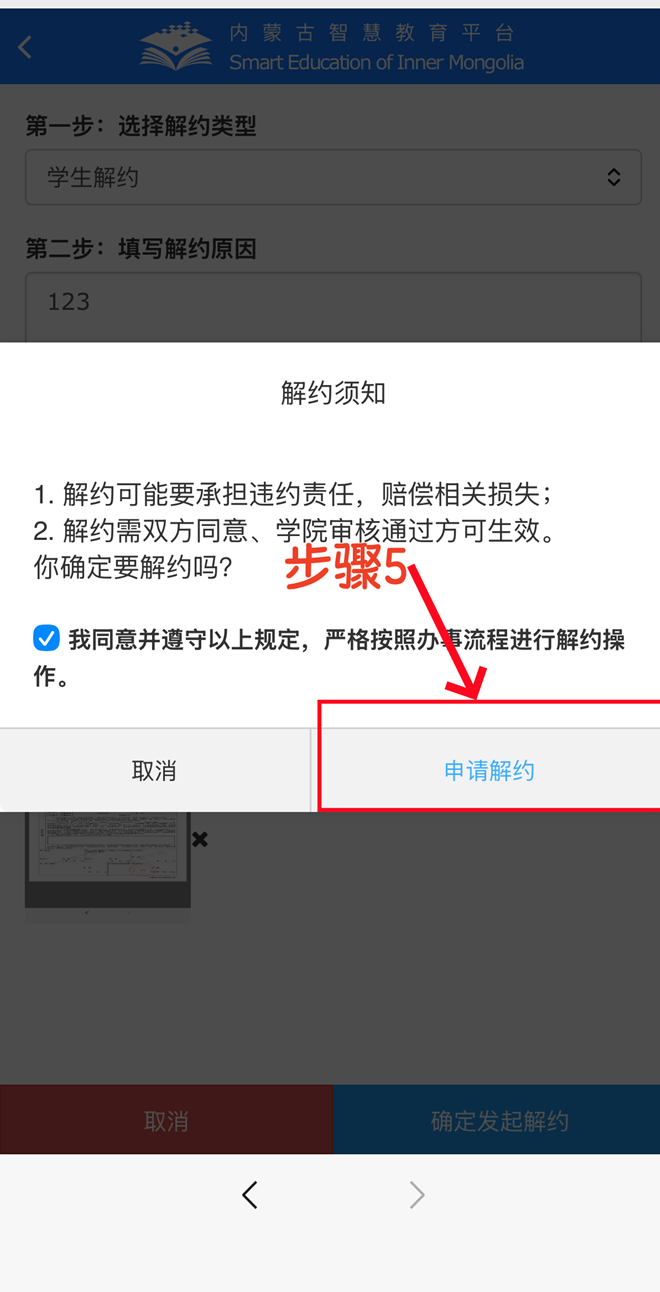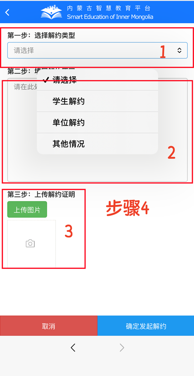 (4)选择“解约类型”并填写“解约原因”以及上传“解约证明”