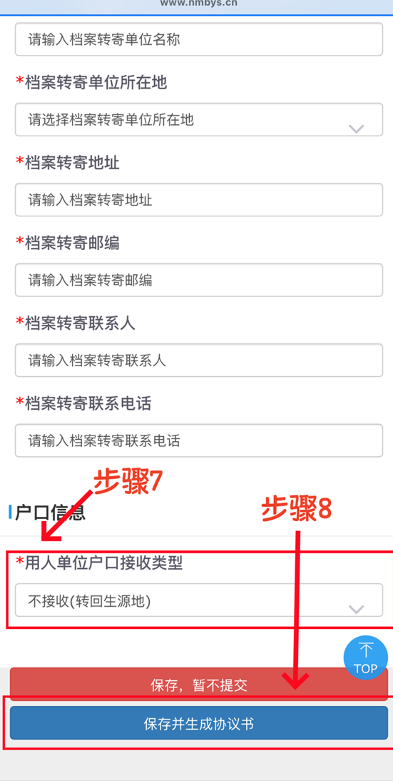 (6)选择“用人单位档案及户口接收类型”