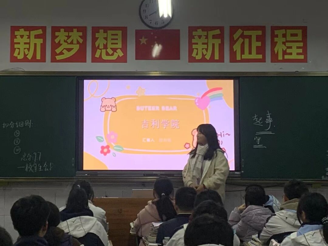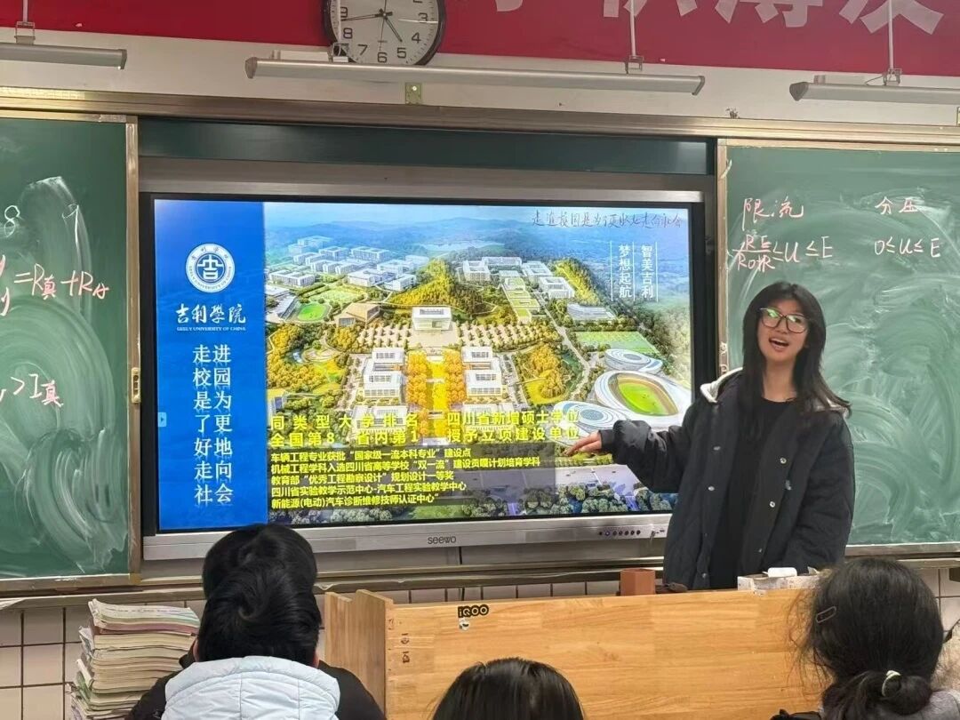 再次走进实验中学的教室,熟悉的课桌和黑板瞬间拉回了我的高中记忆。这次宣讲前,我就注意到同学们对吉利汽车的品牌认知度很高,这让我有了很好的切入点。我重点介绍了网络与新媒体专业的学习内容,以及吉利学院依托集团资源打造的实践平台,也解答了大家关于录取疑问。看到学弟学妹们从一脸好奇到频频点头,主动记笔记,我真切觉得这次分享没白来。
