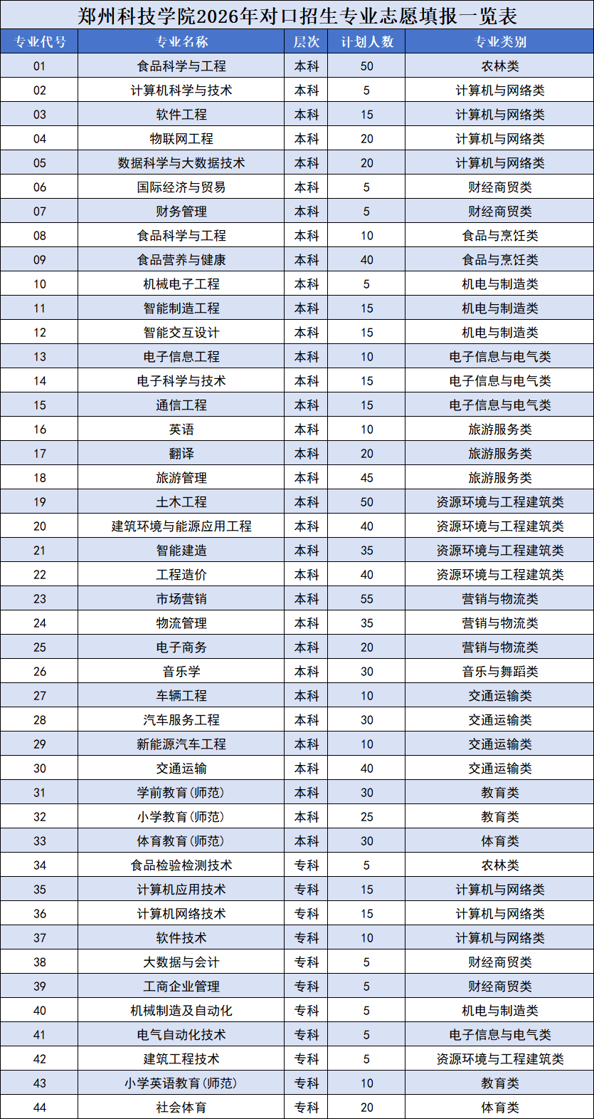 郑州科技学院2026年对口专业招生计划一览表