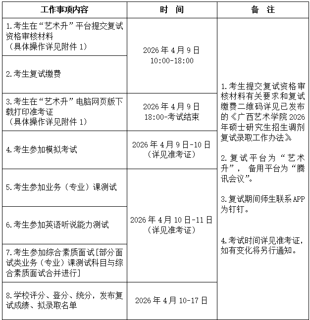 5.考试内容范围、考试用具和考试用纸。参加调剂复试的考生须认真阅读《广西艺术学院2026年硕士研究生招生考试复试业务课考试大纲》,考试内容范围仅供参考,考试内容最终以考试试题为准。