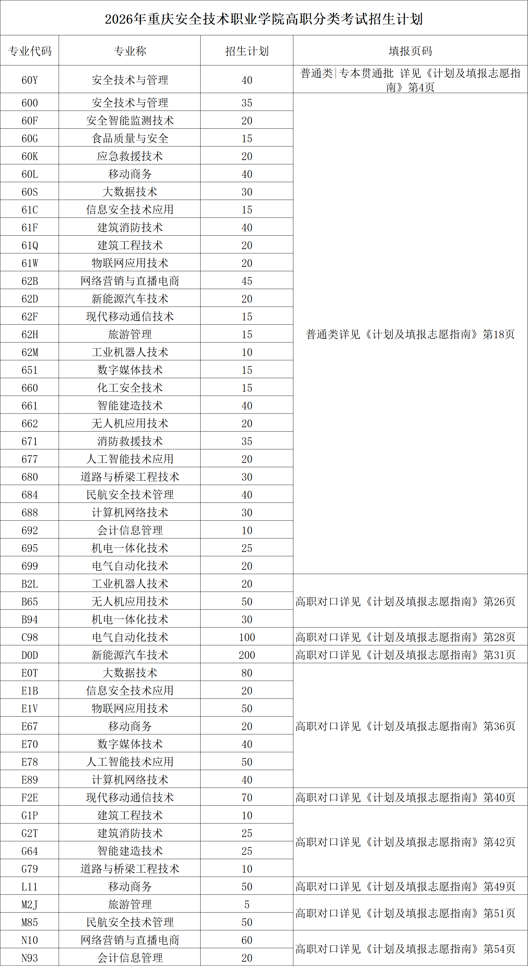 重庆安全技术职业学院2026年分类考试招生计划