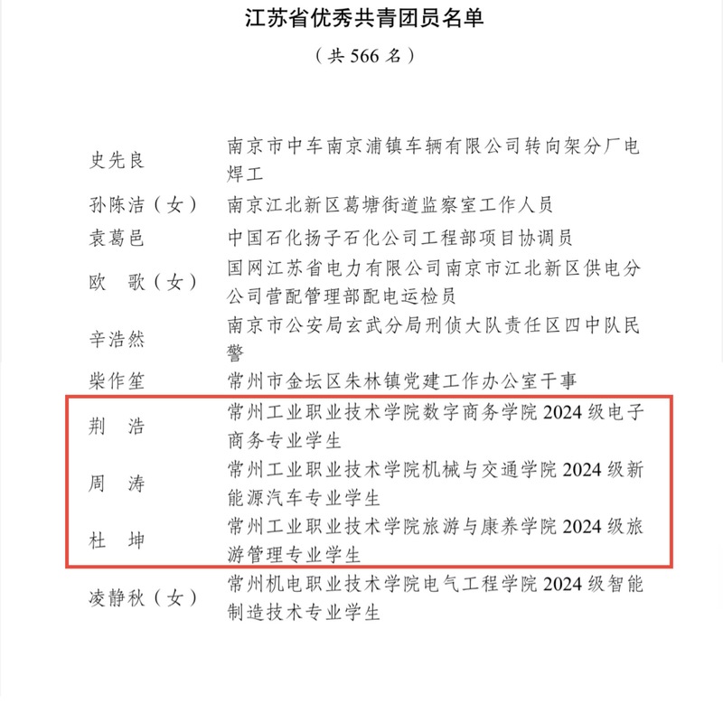 近日,共青团江苏省委公布了2025年全省“两红两优”表彰决定,我校数字商务学院2024级电子商务专业学生荆浩、机械与交通学院2024级新能源汽车专业学生周涛、旅游与康养学院2024级旅游管理专业学生杜坤等3名同学荣获省“优秀共青团员”称号。
