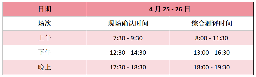 每个专业分为4月25-26日的上午、下午和晚上,共6个场次;