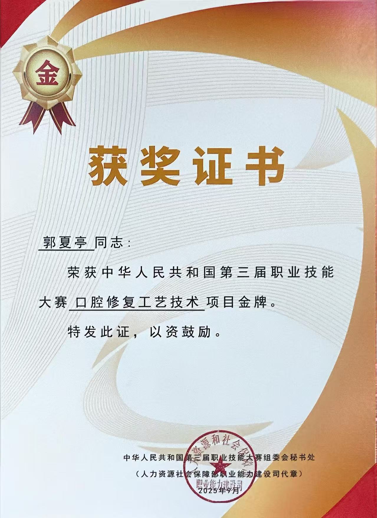 2025年中华人民共和国第三届职业技能大赛口腔修复工艺技术赛项金牌;2025年全国卫生职业院校口腔医学技术操作技能展示荣获个人评审口内数字化印模制取和数字化固定桥修复设计二等奖;2025年湖北省医学职业技术学院口腔医学(技术)专业学生技能竞赛“窝洞制备”“牙体预备”“全口排牙”“口内数字化印模制取”赛项二等奖、“牙体雕刻”赛项三等奖。