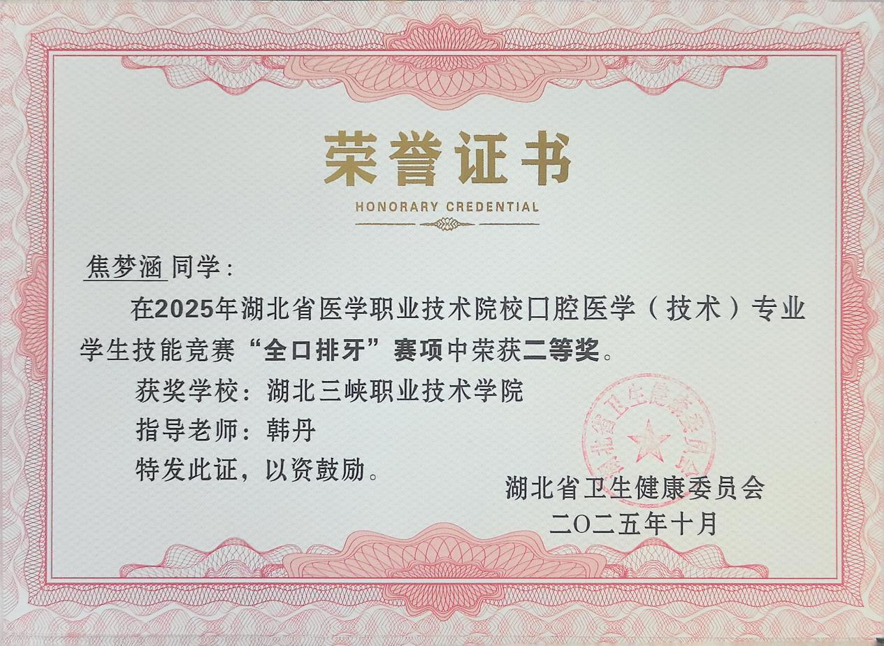 近年来竞赛成果丰硕:2021年获湖北省医学职业教育口腔医学技能大赛一等奖3项、二等奖4项、三等奖4项;2023年获湖北省口腔技能竞赛团体二等奖1项、三等奖1项,全国卫生职业院校口腔技能展示一等奖1项、二等奖5项、三等奖1项;2024年获世界职业院校技能大赛银奖、全国职业院校口腔技能大赛二等奖1项、三等奖3项;2025年斩获中华人民共和国第三届职业技能大赛口腔修复工艺技术赛项金牌,全国卫生职业院校口腔技能展示二等奖2项,湖北省口腔技能竞赛二等奖4项、三等奖1项。