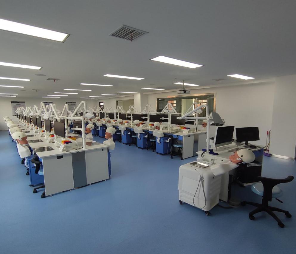 建有仿真头模模拟、口腔修复、口腔内科、口腔颌面外科、消毒室等10个一体化实训室,配备仿真头模、技工桌、牙科综合治疗椅、临床模拟示教系统、热牙胶充填系统等专业设备,打造与临床高度贴合的全场景模拟诊疗环境。