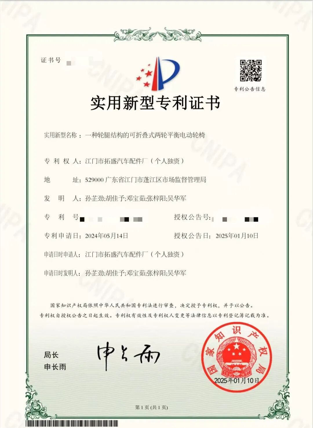 ▲邓宝茹和团队获得的专利证书
