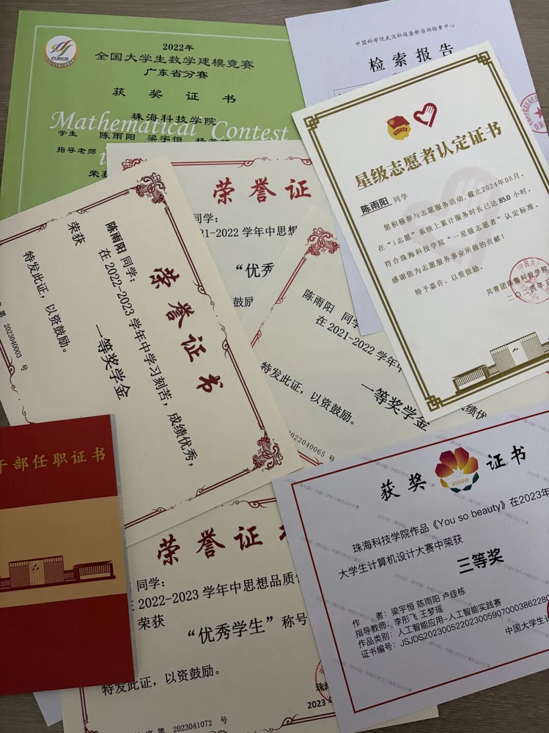 ▲陈雨阳本科期间的荣誉证书