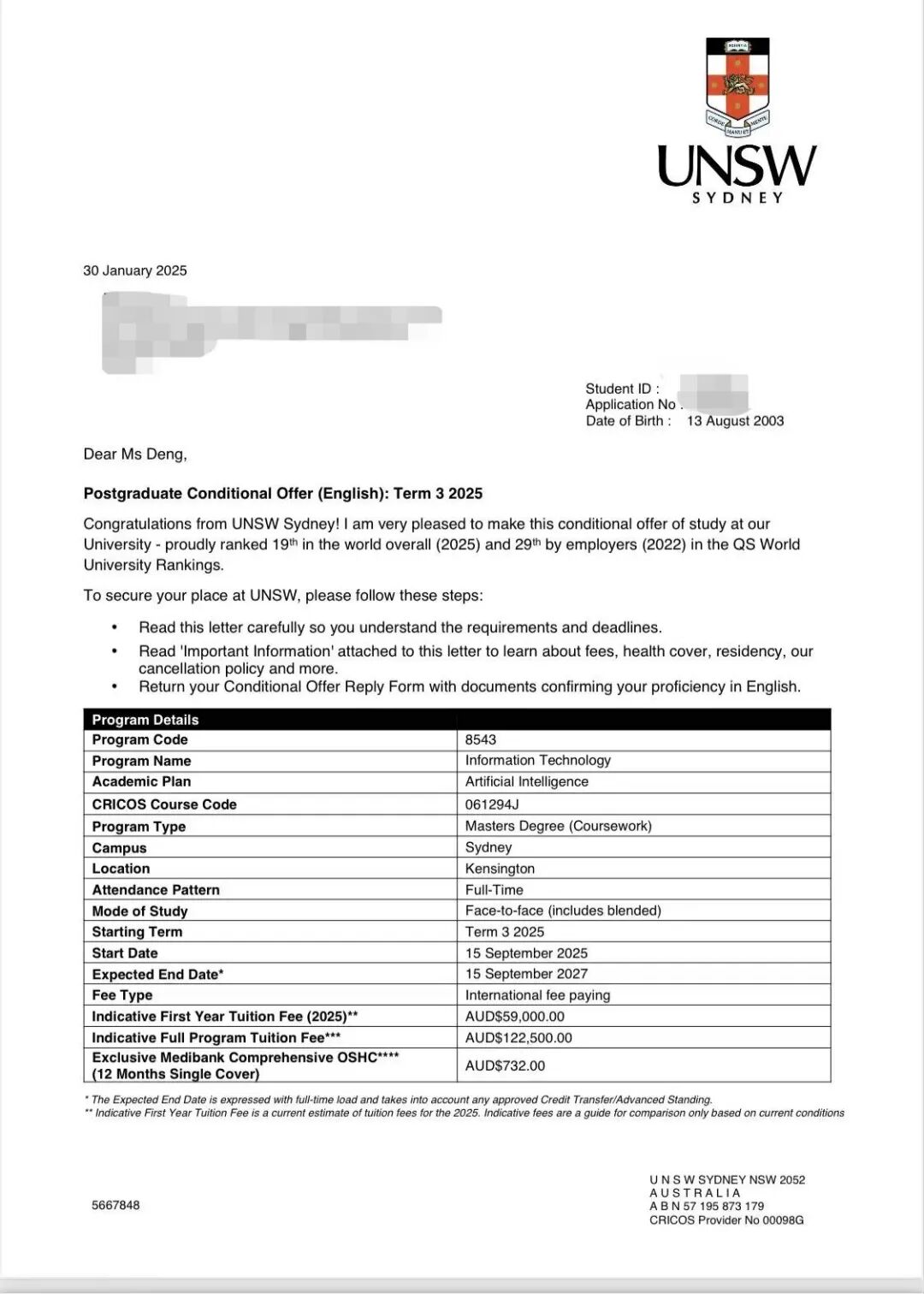 ▲邓宝茹收到新南威尔士大学Offer