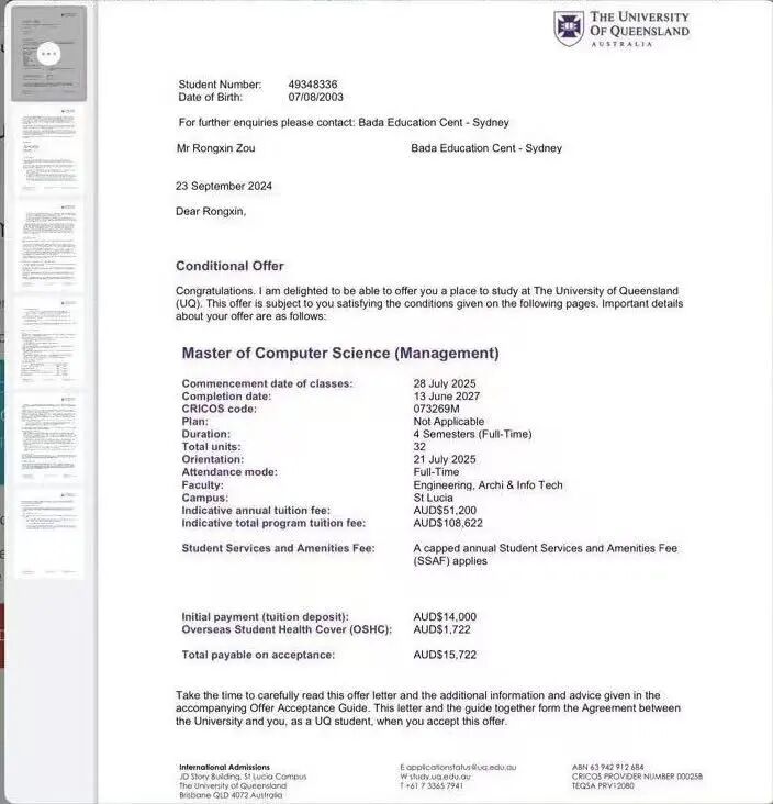 ▲邓宝茹收到悉尼大学Offer