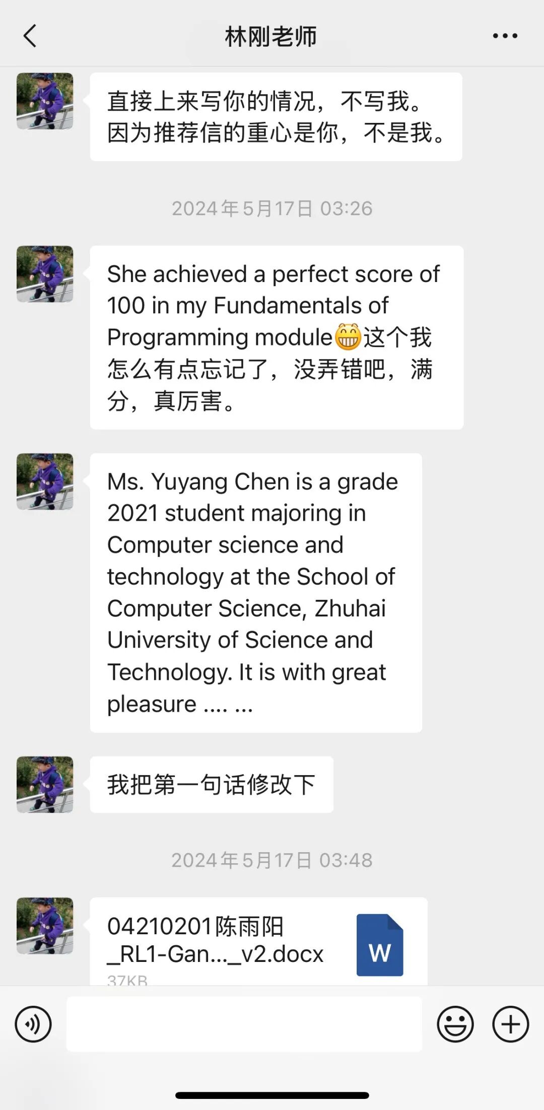 陈雨阳认为老师们全方位的指导与关怀