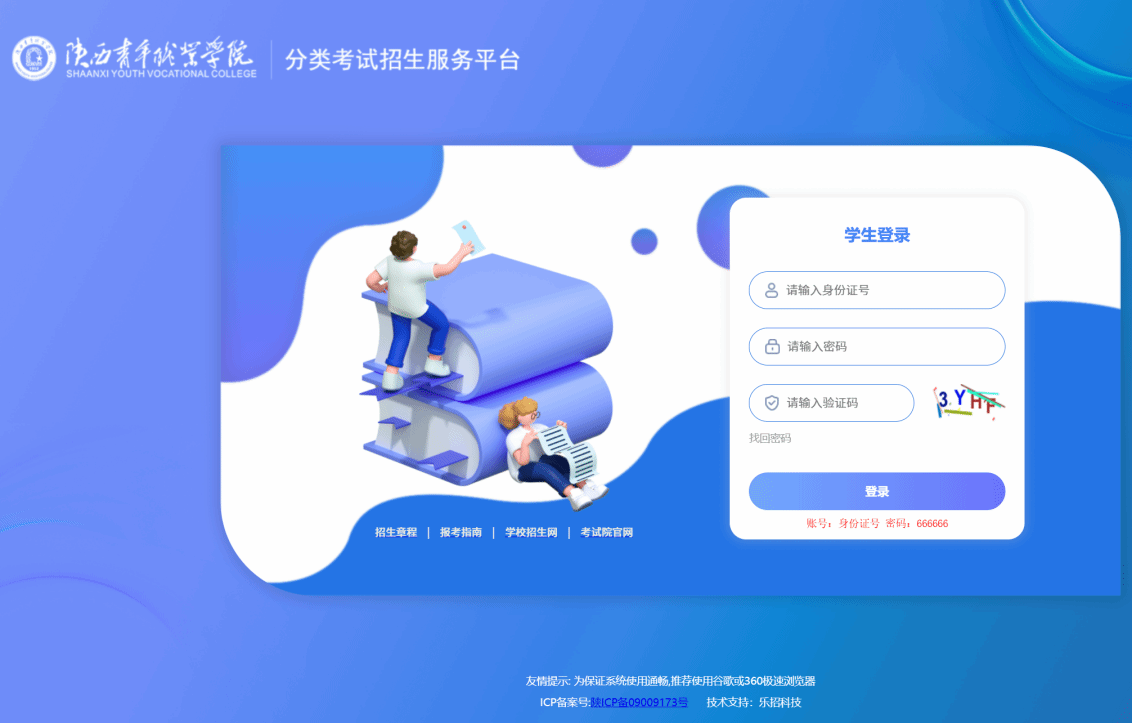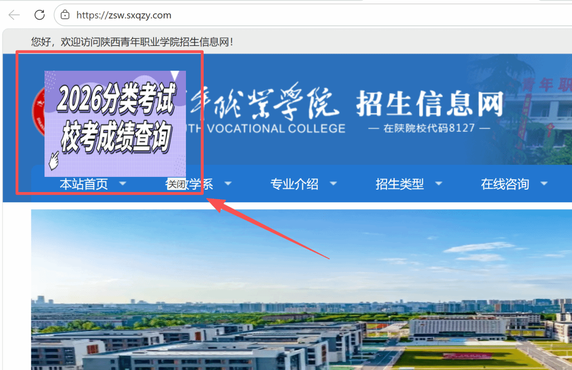 方式二:登录陕西青年职业学院招生信息网(网址:https://zsw.sxqzy.com),点击页面中的“2026分类考试成绩查询”,即可跳转至“陕西青年职业学院分类考试招生服务平台”登录页面,查询递补预录取结果。
