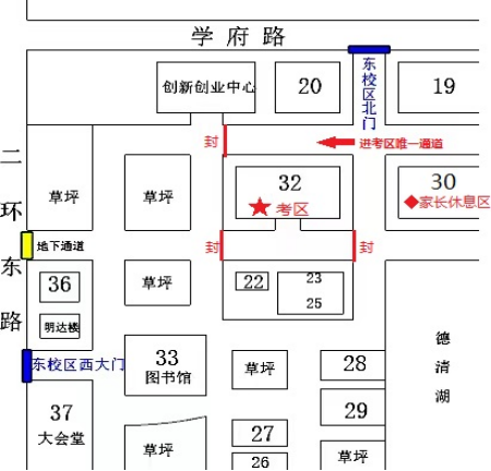 (二)综合测试当天,考生统一从东校区北门(学府路)进校。陪考家长可随考生进校,请按照工作人员指引在指定休息区等候。私家车请遵从交警现场指挥,按要求停靠。为避免造成道路拥堵,倡导大家绿色出行,尽量搭乘公共交通来校。