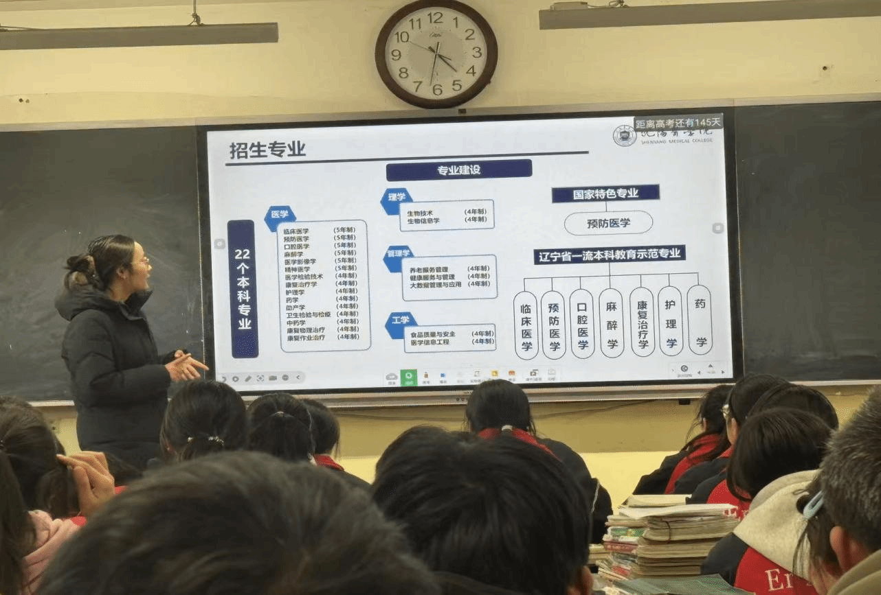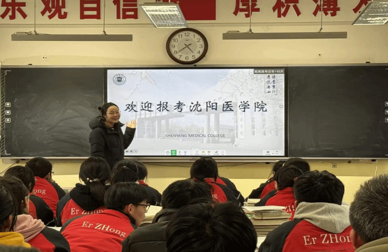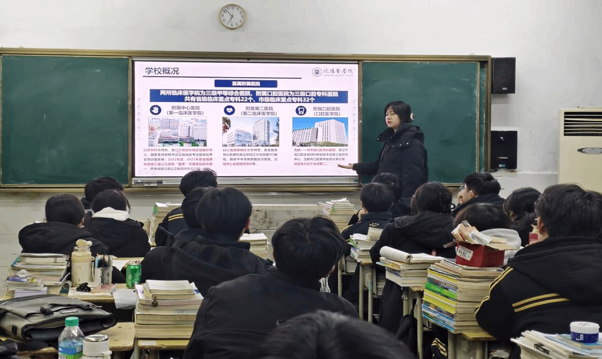 ②宣讲过程:宣讲当日,依托学校配套PPT,系统讲解沈阳医学院办学实力及临床医学专业培养体系、发展方向;结合自身就读经历,重点讲解高考各科高效备考方法与考前心态调整技巧;同时设置答疑互动环节,针对性解答学子疑问。