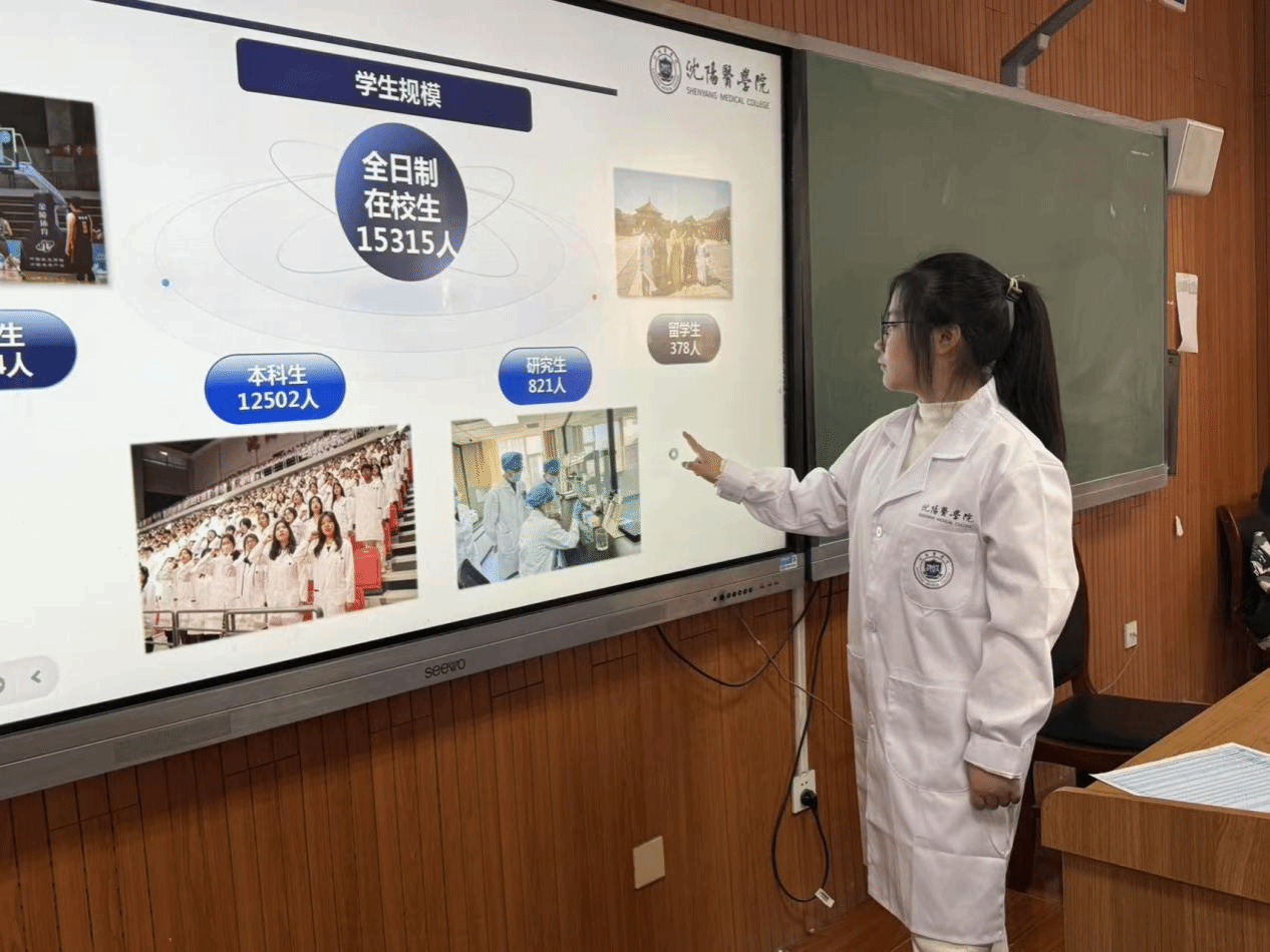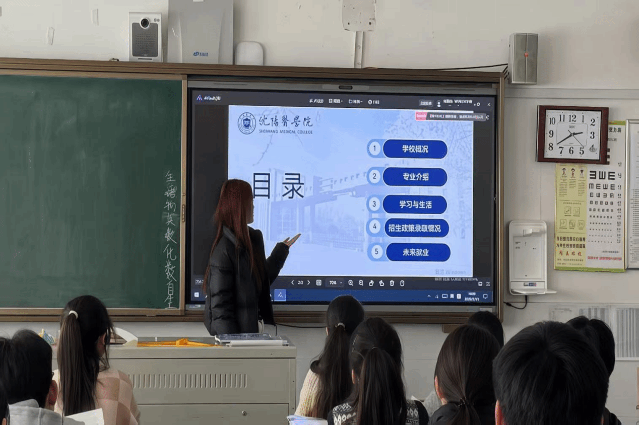 ②宣讲过程:首先我在班级播放了学校宣传视频,校园风貌、学术氛围与专业特色迅速吸引高三学子的关注。随后结合PPT系统宣讲,全面介绍学校办学底蕴、学科优势、专业设置及就业前景;最后分享自身从高三备考到沈医求学的真实体验,让学子对医学专业与大学生活形成更真切的认知。