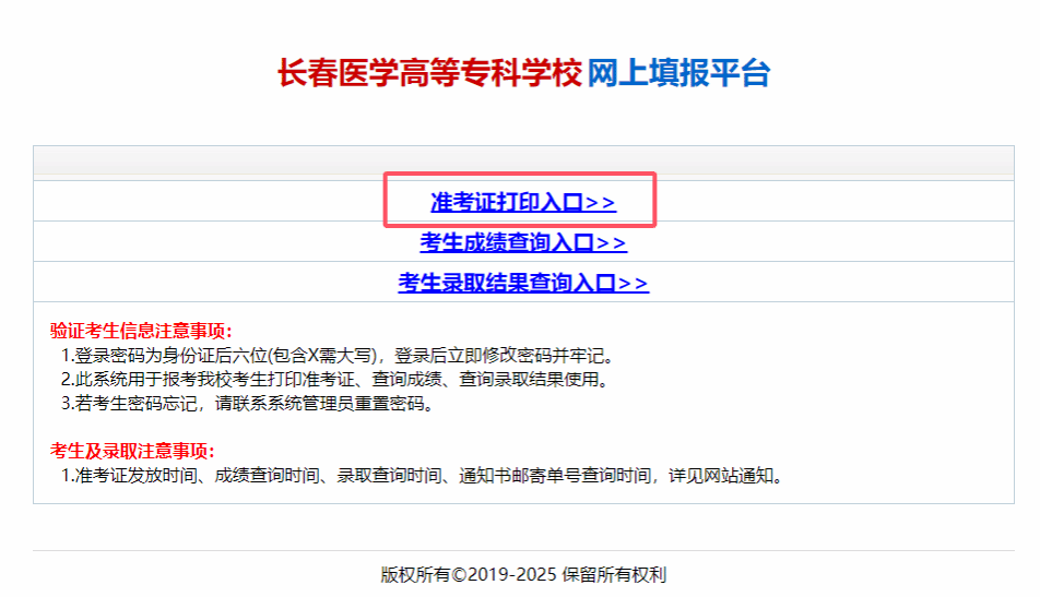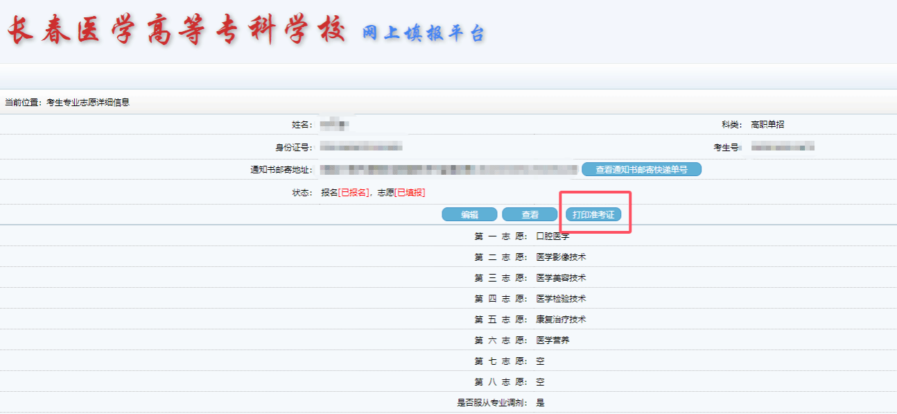 2. 在《长春医学高等专科学校网上填报平台》界面,点击准考证打印入口,输入相关信息,登录进入“考生专业志愿详细信息”界面。其中,登录密码为身份证后六位(也包含X,须大写)