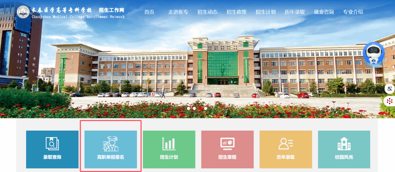 1. 进入我校招生工作网(https://zs.ccmc.edu.cn/),点击《高职单招报名》,进入《长春医学高等专科学校网上填报平台》