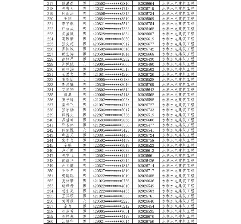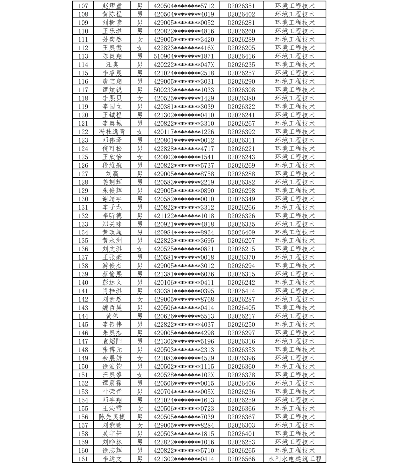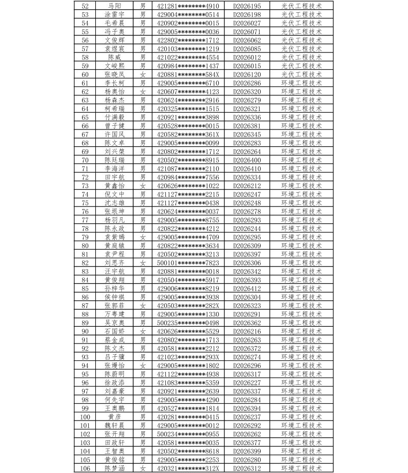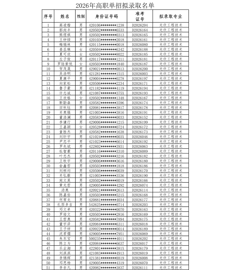 根据《湖北省教育厅关于做好2026年高职院校单独考试招生工作的通知》(鄂教职成函〔2026〕1号)和《三峡电力职业学院2026年高职单独考试招生章程》要求,我校2026年高职单独招生各专业拟录取名单公示如下,公示期7天(2026年4月11日—4月17日)。公示期内,如有异议,请向学校相关部门反映。