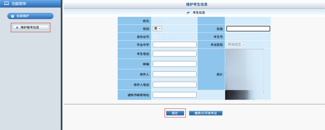 考生登录:点击“考生信息维护及缴费入口”输入以下考生信息校验考生身份:身份证号码、报名序号、姓名。