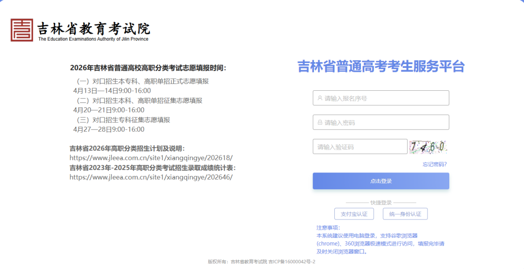 | 4月13-14日 (每日9:00 -16:00) | 考生登录吉林省普通高考考生服务平台正式填报志愿 | 网址https://gk.jleea.com.cn |