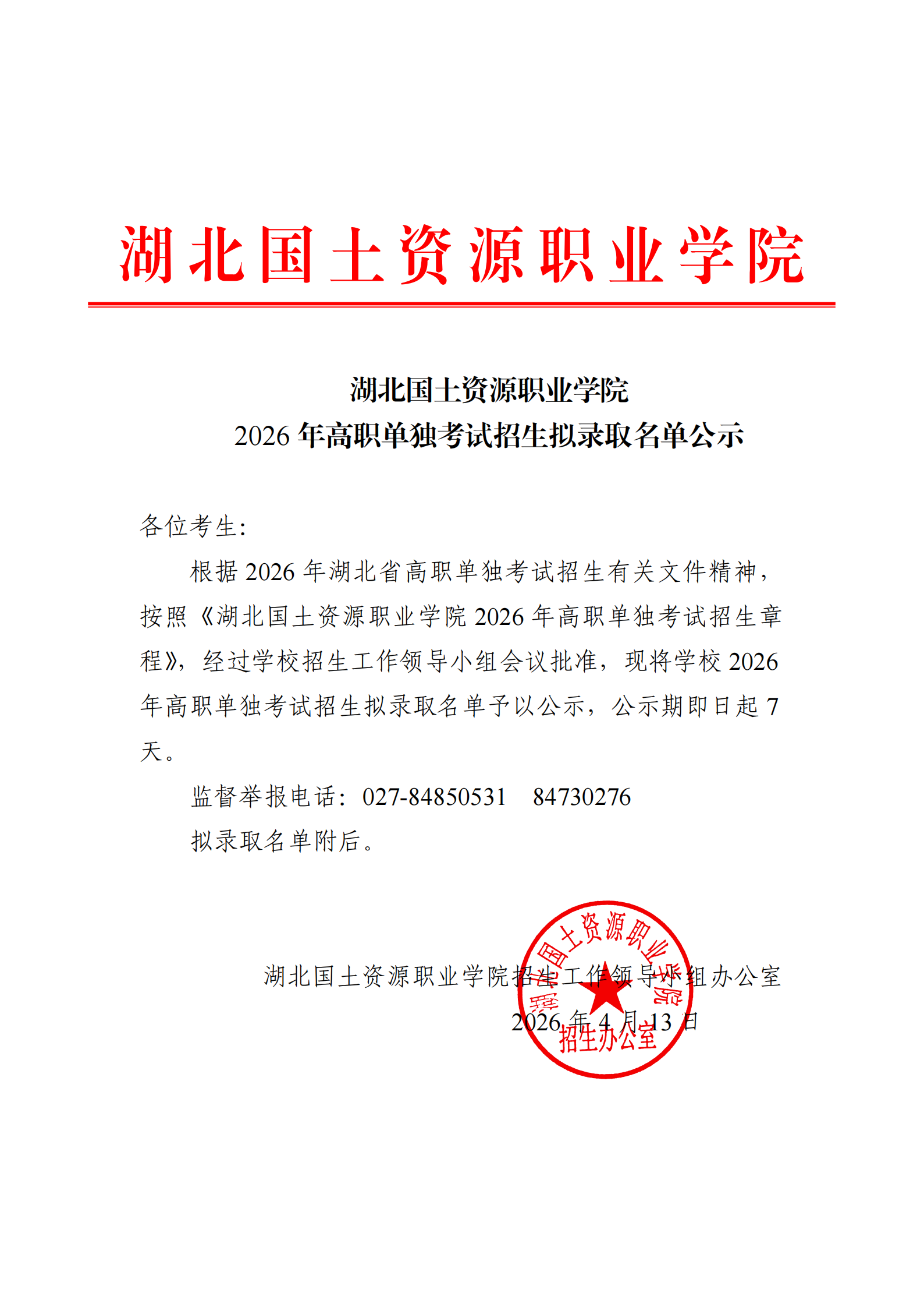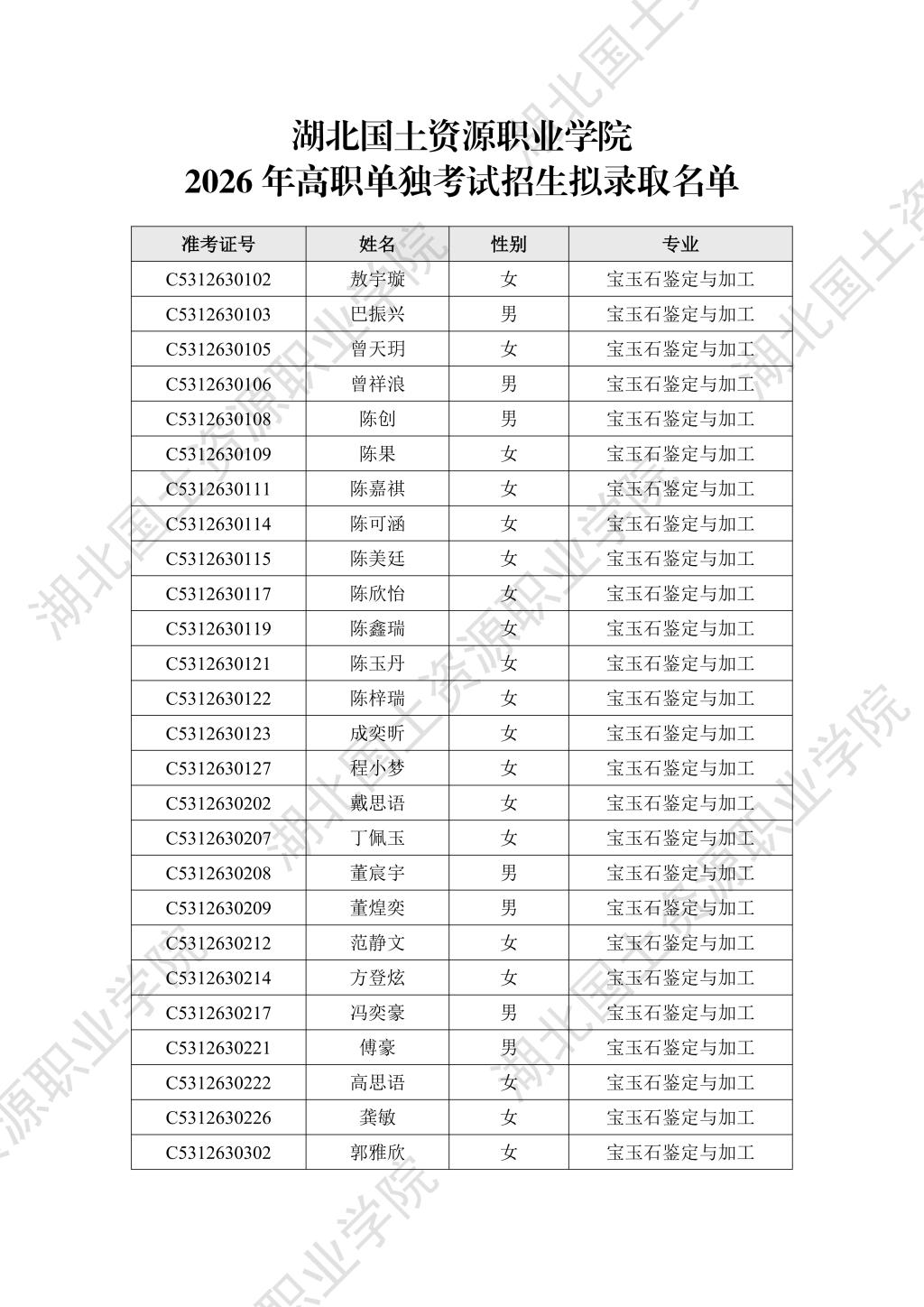 学校2026年高职单独考试招生拟录取名单公示