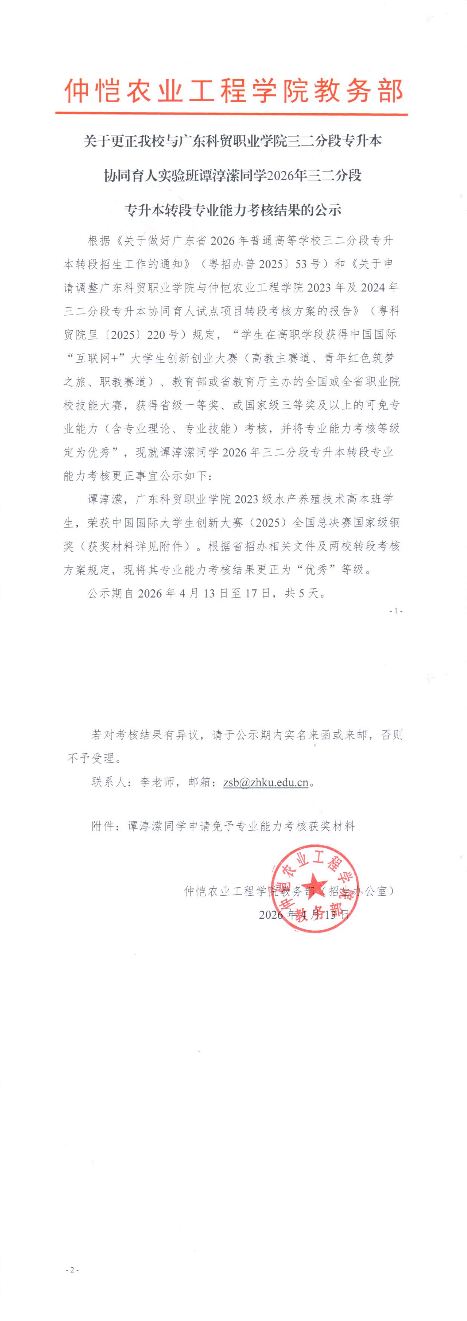 关于更正我校与广东科贸职业学院三二分段专升本协同育人实验班谭淳潆同学2026年三二分段专升本转段专业能力考核结果的公示