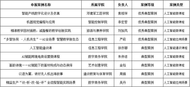 获奖案例覆盖了旅游康养、智能控制、跨境电商、通识教育、信息工程等多个学院和专业领域,体现了我校推动人工智能与各专业以及相关课程深度融合、构建“人工智能+”教育教学新生态的广泛探索。