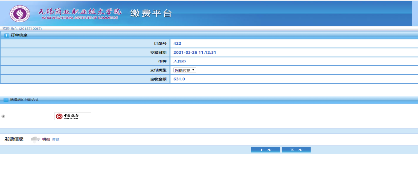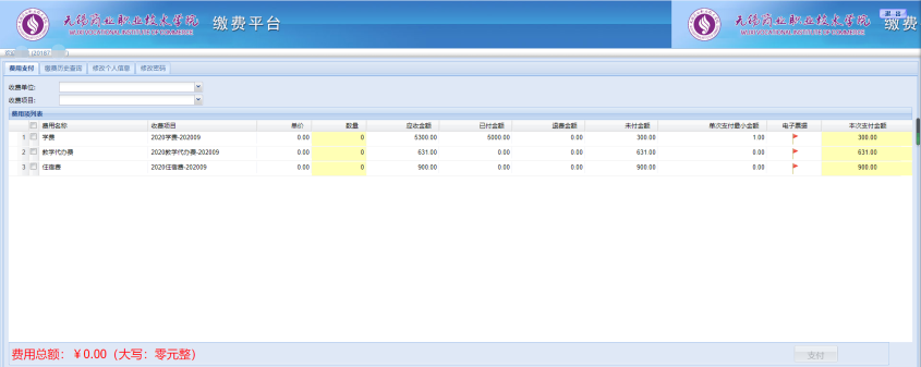 (2)直接输入以下网址(“http”后面的“S”一定要加)https://qp.wxic.edu.cn/payment/进入上图界面。用户名为考生身份证号,密码为Wxsy+身份证后六位 (W为大写xsy为小写)。登陆后选择相应的缴费进行缴费,如下图。(身份证号最后一位如果是X要大写)