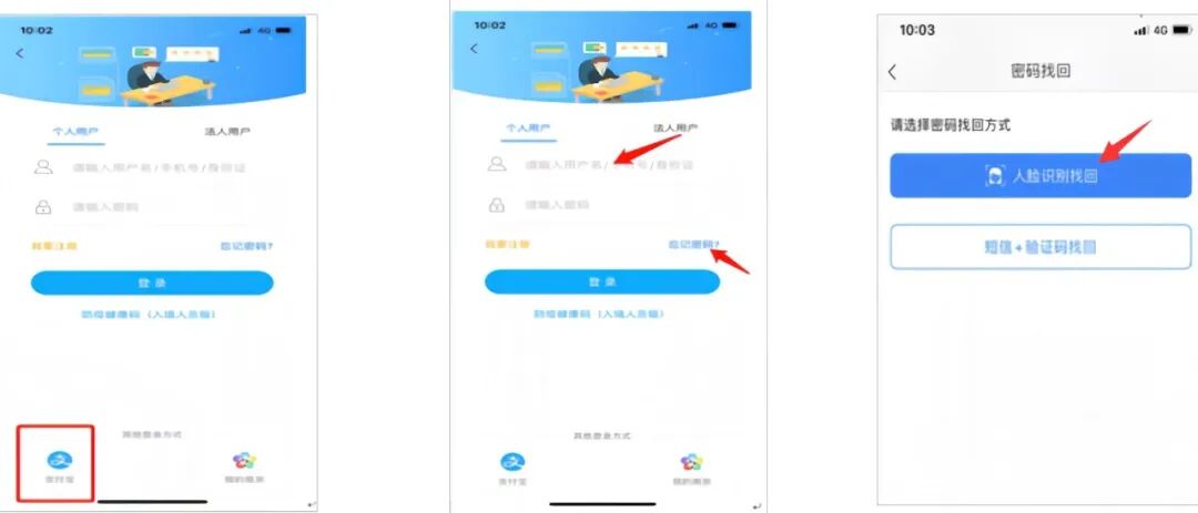 2.可直接点左下角支付宝授权登录;或者输入身份证号,点忘记密码,用人脸识别方式重置密码登录。(若输入身份证号后提示无用户不存在,请先行注册。)