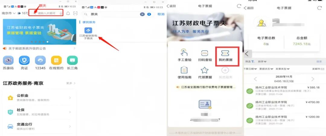 3.登录后,主页顶端搜索“票夹”,点击“江苏省财政电子票夹”,可查询到相应的电子票据下载打印。