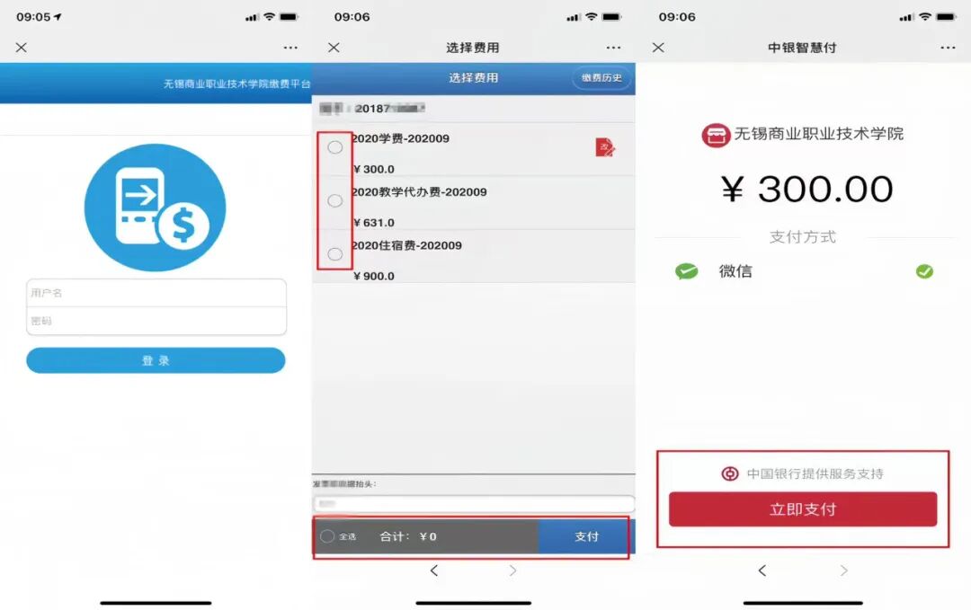 (2)进入“智慧无锡商院”服务号,然后点右下方的在线缴费,进入上图界面。用户名为考生身份证号,密码为Wxsy+身份证后六位 (W为大写xsy为小写)。登陆后选择相应的缴费进行缴费,如下图。(身份证号最后一位如果是X要大写)