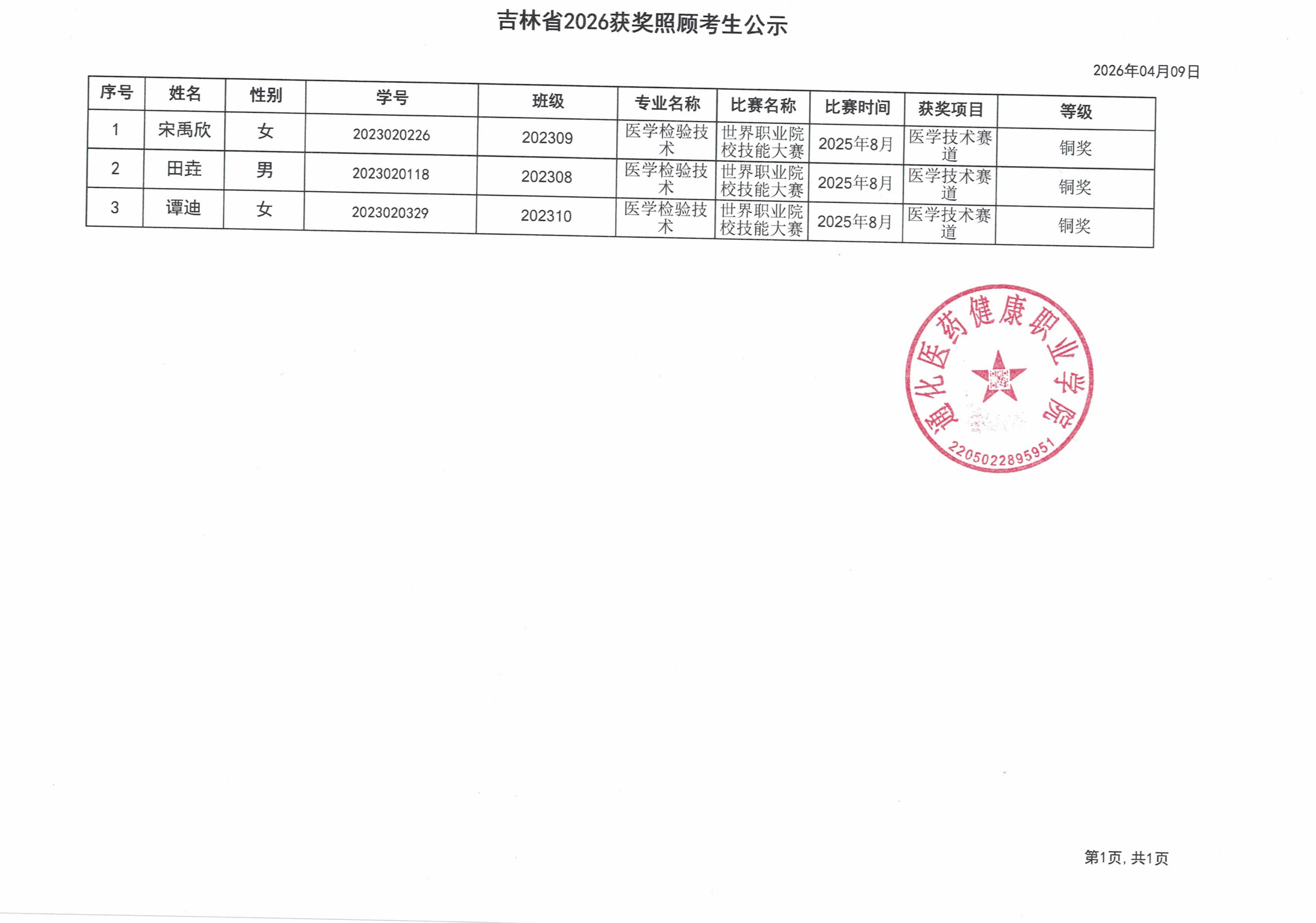 通化医药健康职业学院2026年专升本获奖考生照顾加分公示表
