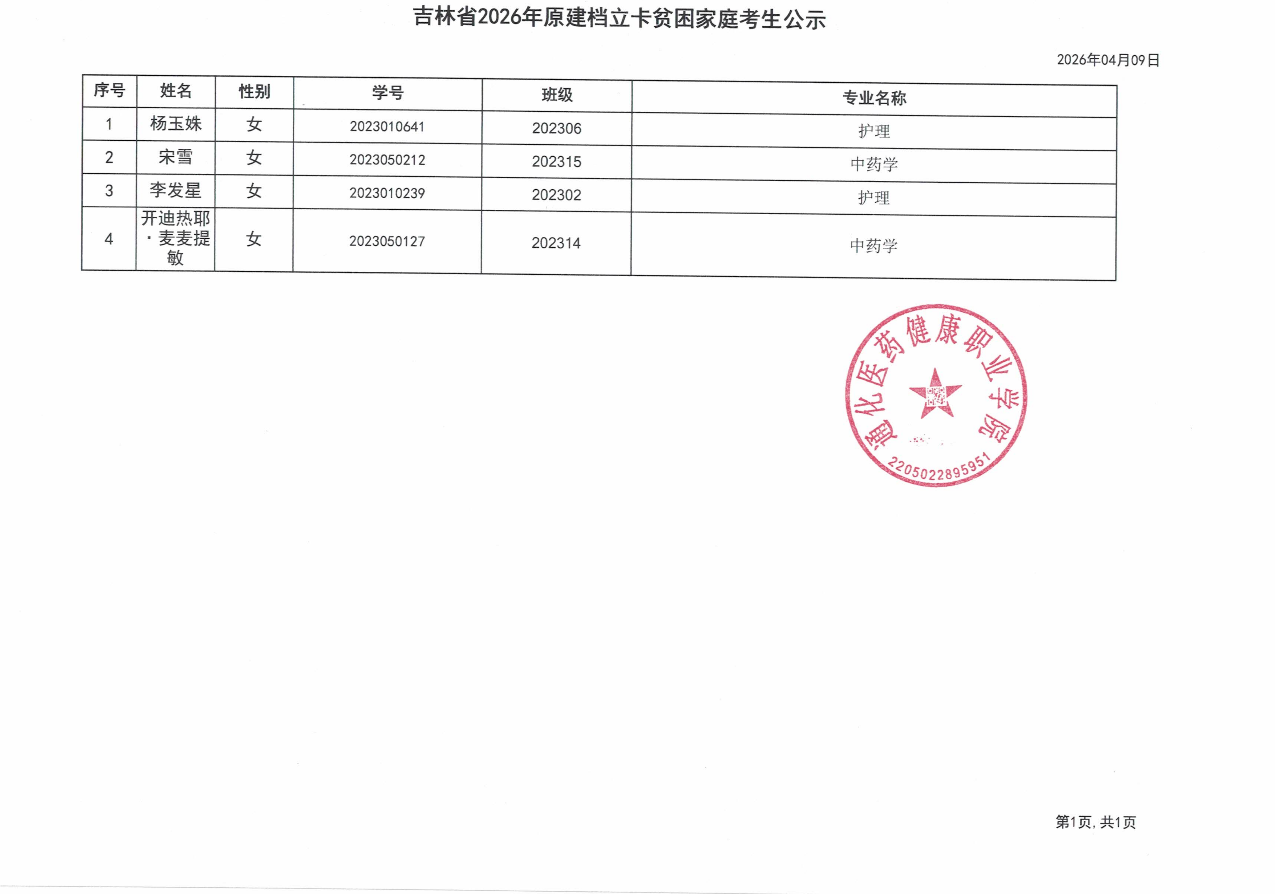 通化医药健康职业学院2026年专升本原建档立卡贫困家庭考生公示表