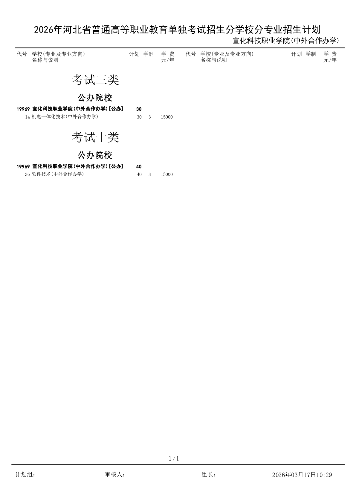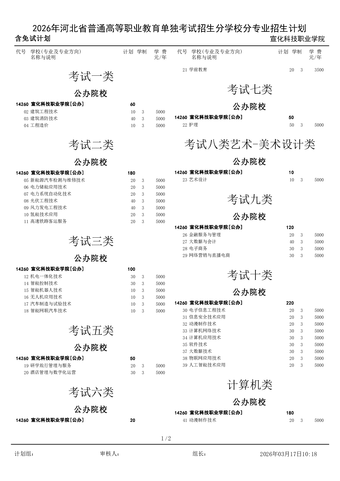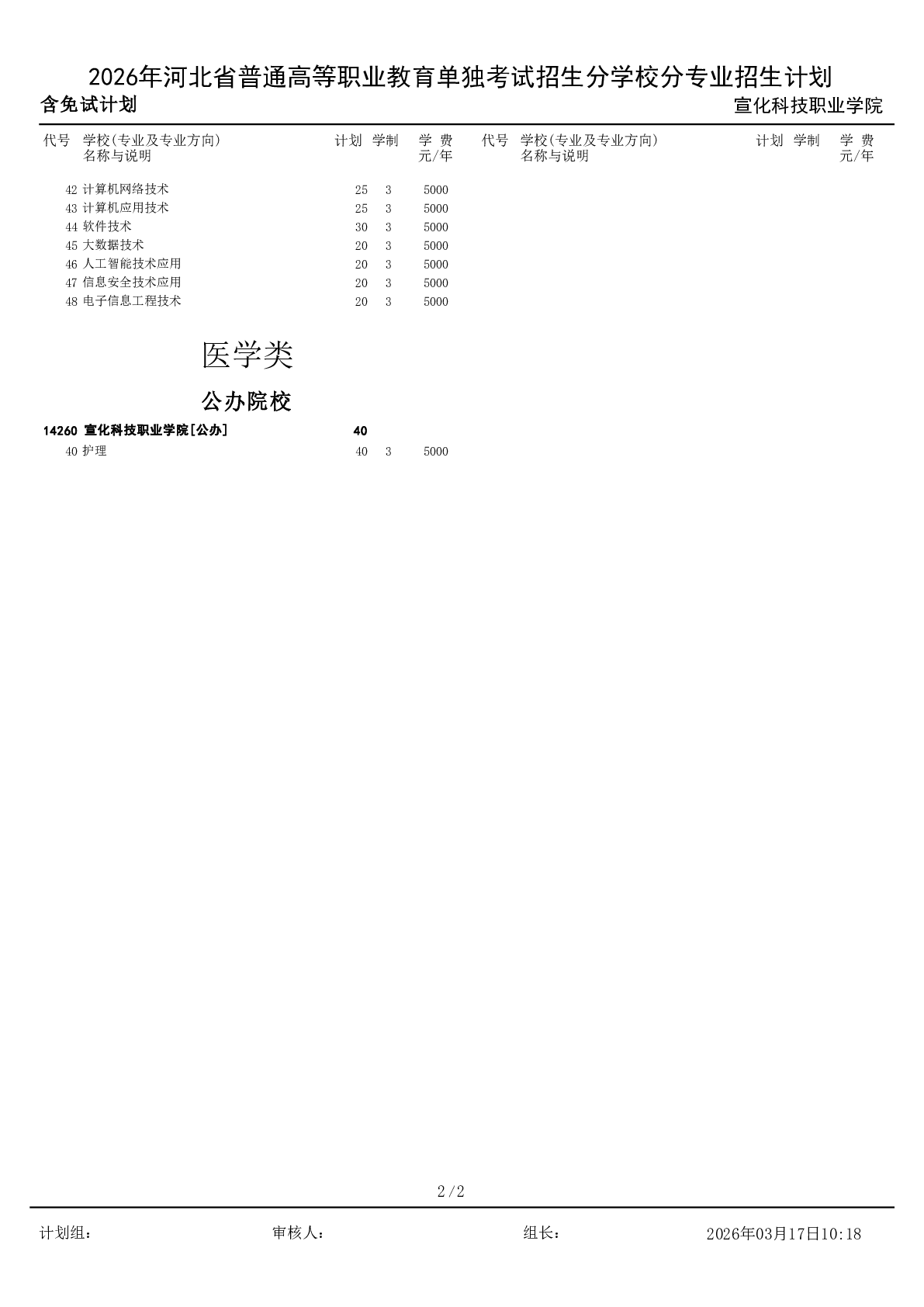 2026年宣化科技职业学院单独考试招生分专业招生计划