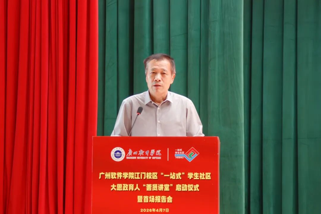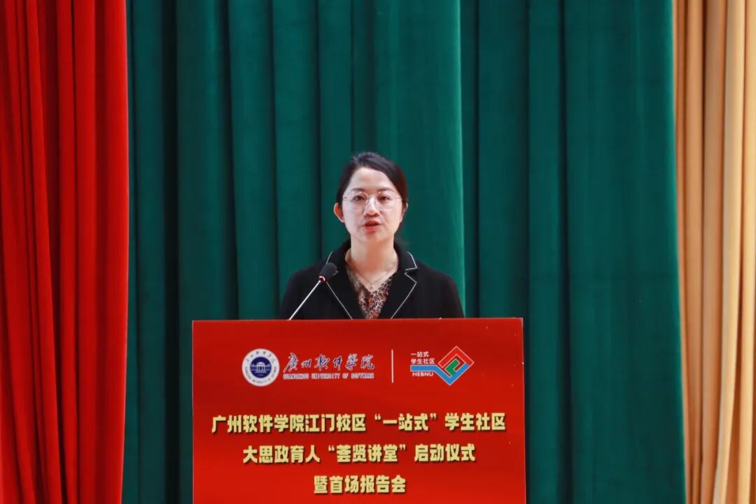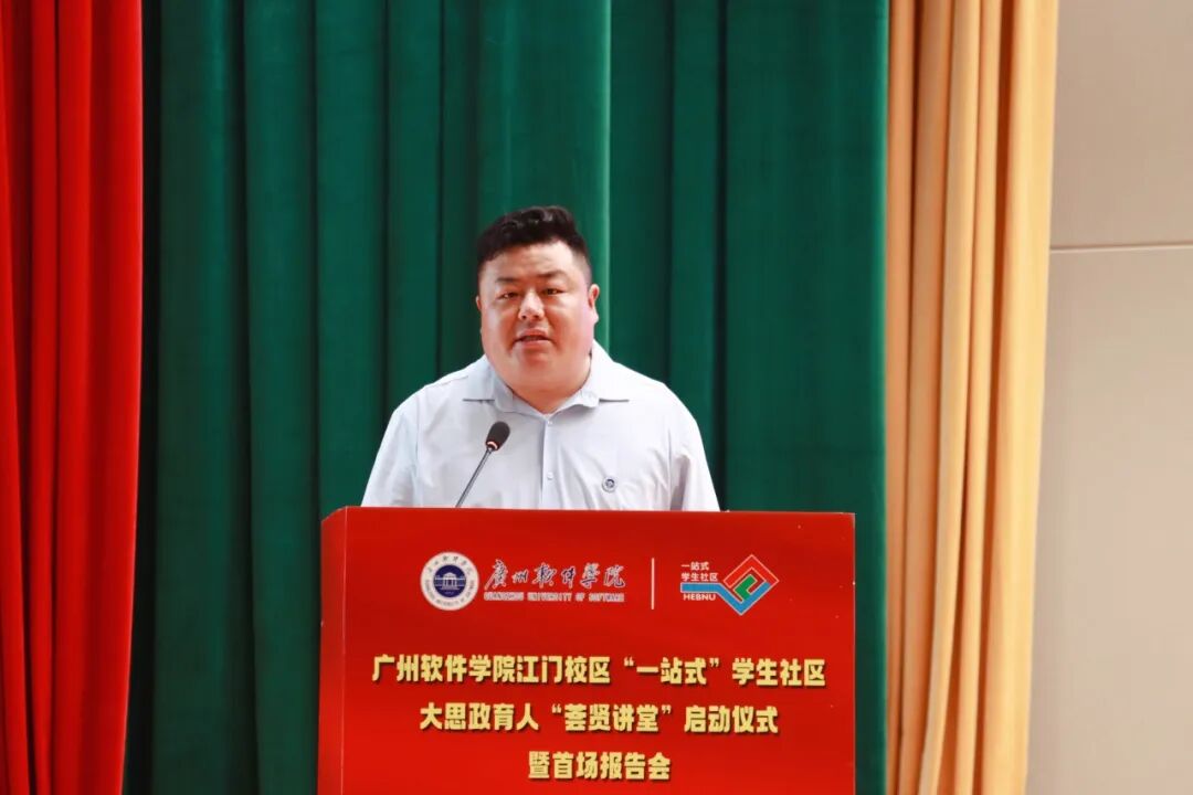 4月7日下午,广州软件学院江门校区“一站式”学生社区大思政育人“荟贤讲堂”启动仪式暨首场报告会在图书馆大礼堂举行。新会区双水镇党委书记程文杰,新会区委党校常务副校长李红卫,新会区委宣传部副部长黄金杏,新会区教育局党组成员、副局长陈晓东,双水镇党委委员梁健芬,广州软件学院校长张强,副校长、江门校区管委会主任张屹,区镇相关部门领导,江门校区全体党员、入党积极分子、入团积极分子、团员代表以及校外特聘讲师共同出席活动。启动仪式由江门校区学生工作部主任闫新利主持。