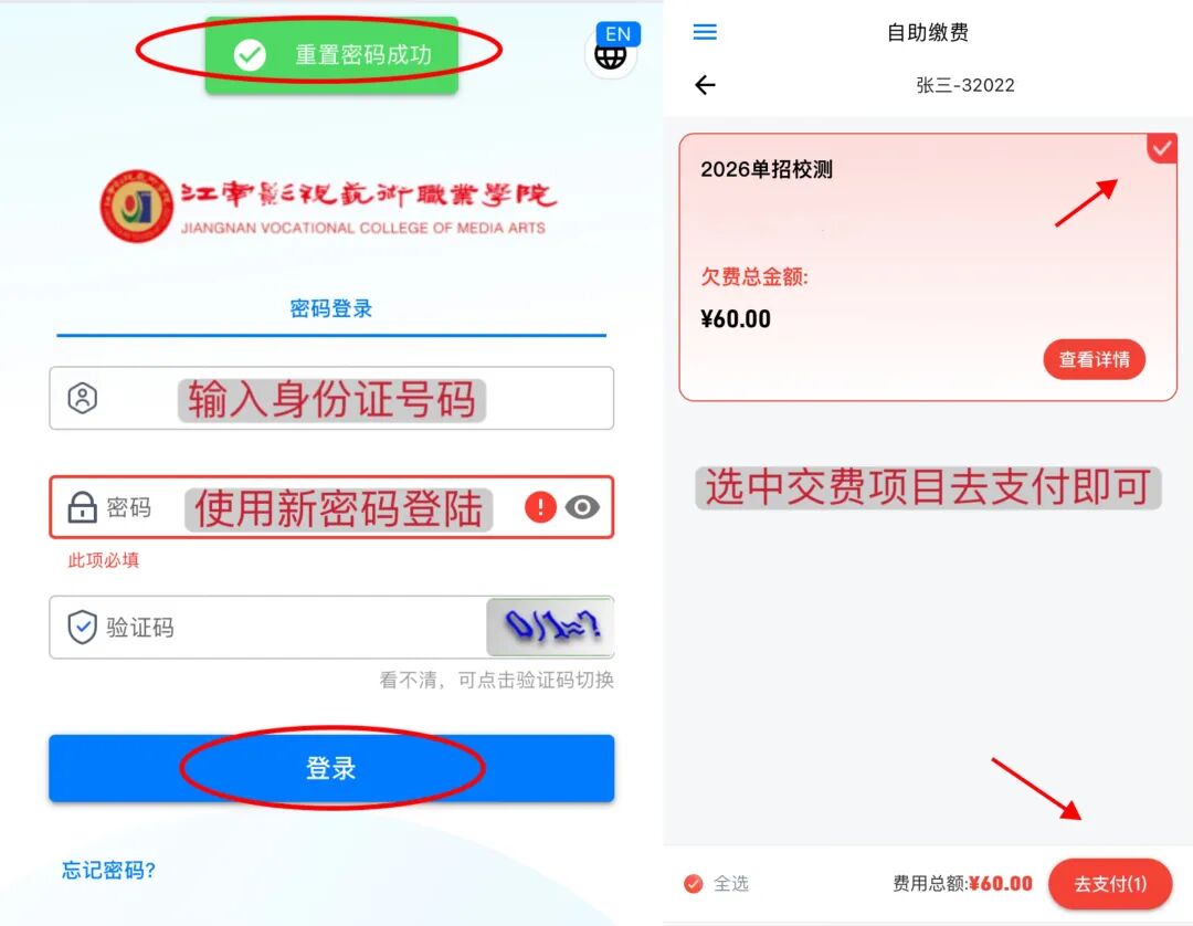 4、密码设置确定之后,跳转登录界面,输入身份证号码和新密码登录,选择对应的交费项目,完成支付即可。