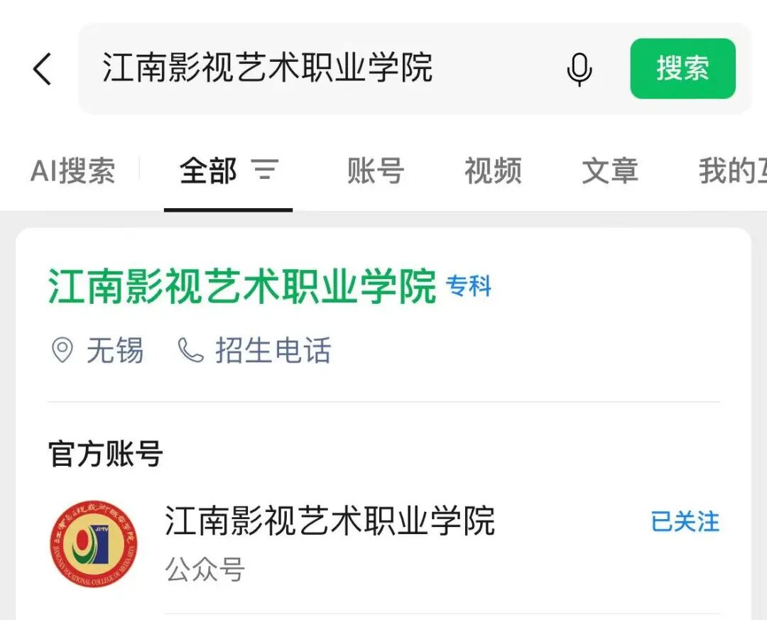 1、手机端通过微信查找“江南影视艺术职业学院”公众号。 也可以长按并识别下图二维码,即可关注我校公众号。