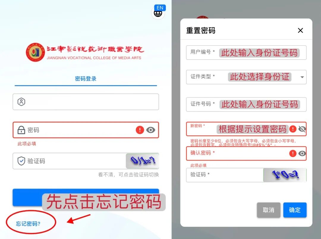 3、进入缴费系统后,先点击“忘记密码”,进行用户密码设置。用户编号为考生身份证号(身份证号最后一位如果是X要大写)。设置新密码长度至少8位,必须包含大写字母,必须包含小写字母,必须包含数字,必须包含特殊符号(!@#$%&*-)。